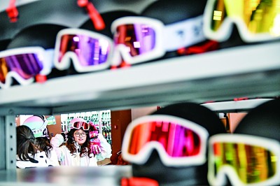 在四川汶川县羌人谷滑雪场,滑雪爱好者租赁滑雪装备。新华社发