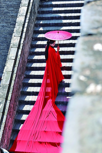 一名游客身着汉服在西安城墙上拍照。近年来,租赁汉服拍写真成为很多游客不可或缺的旅游体验。新华社发