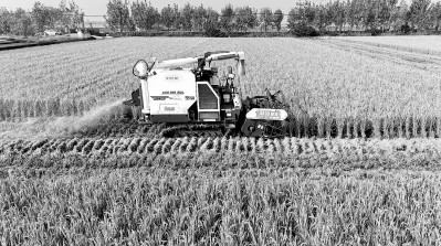江苏连云港无人驾驶收割机穿梭田间收割水稻。光明图片/视觉中国