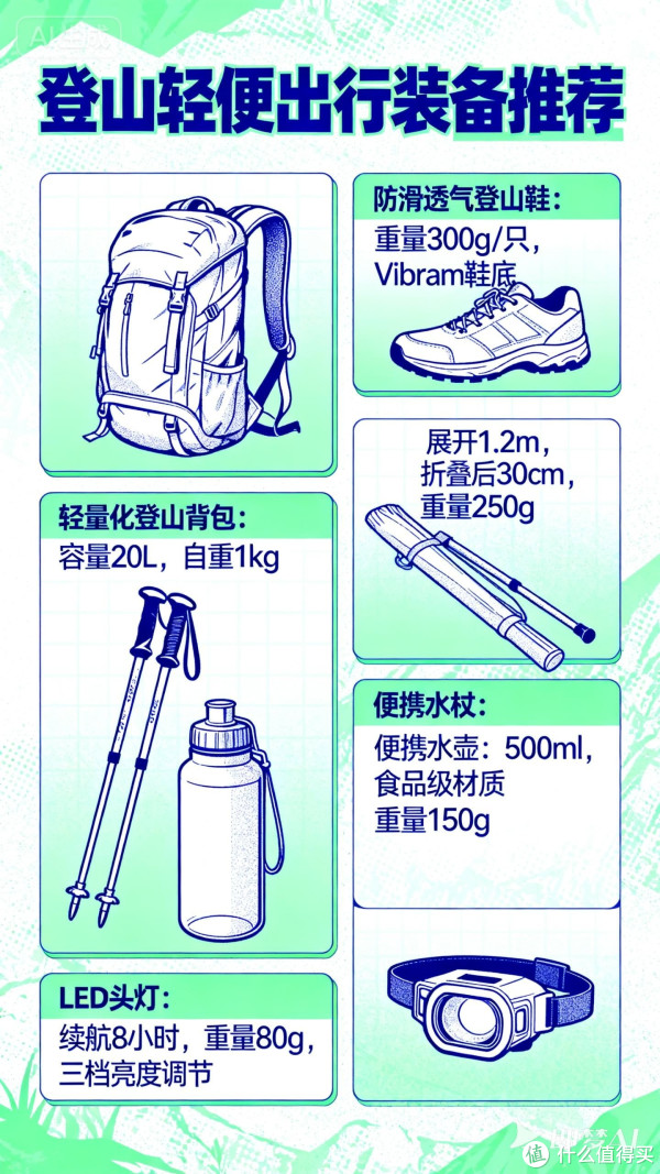 · 鞋履:一双越野跑鞋(适应城市与轻度户外)+一双营地凉鞋